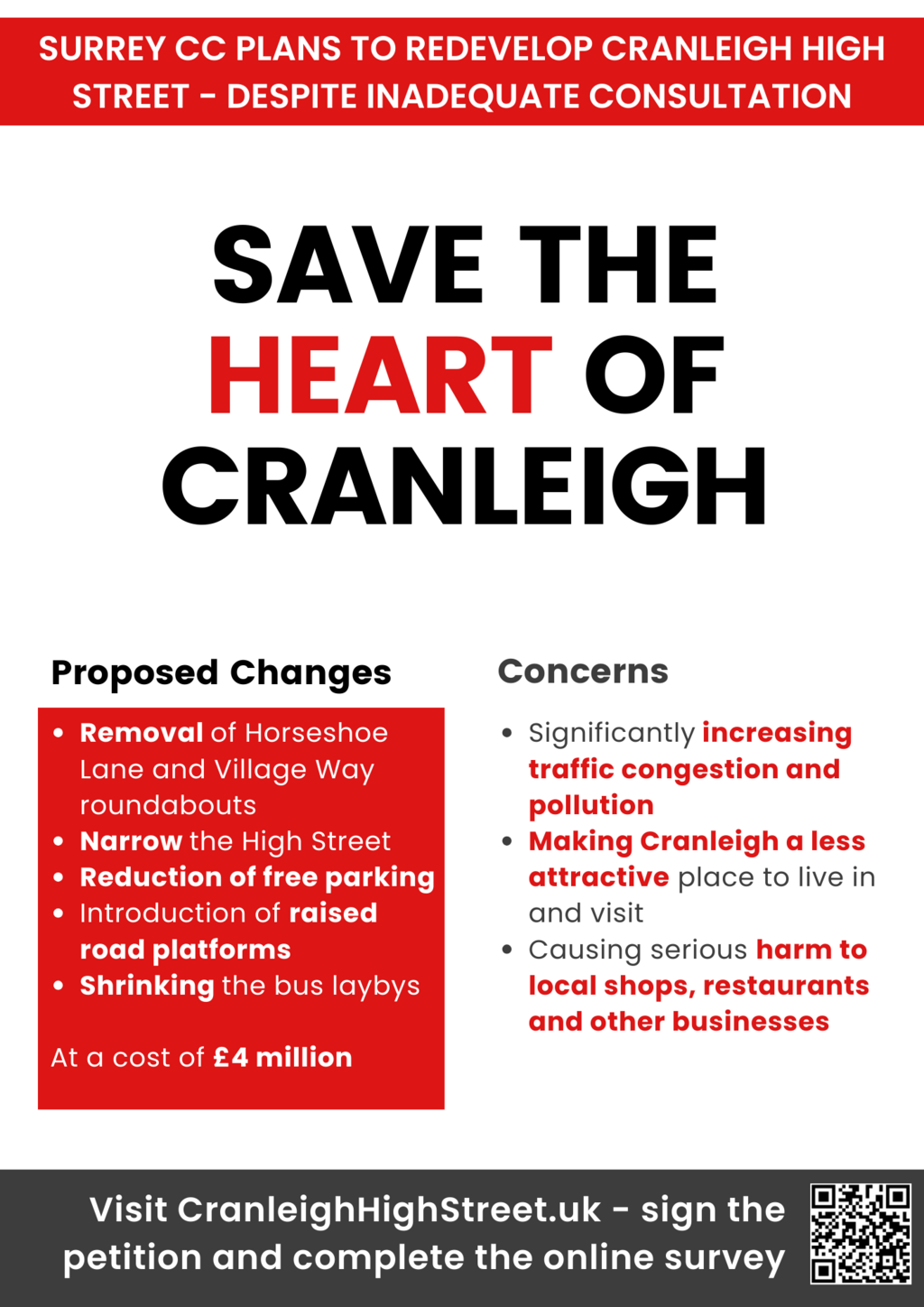 Cranleigh High Street Redevelopment | Lots of information on this website about the proposals for further information, and/or sign up to receive project updates from Surrey County Council via the Commonplace website here: https://cranleighhighstreet.commonplace.is/ |
