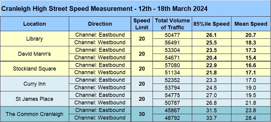 The table below shows the 85 percentile speeds for the three locations in scope, for the period 7am to 7pm over the 7 days it was measured, as can be seen there is absolutely no speed issue - as all the 85 percentile measures in the centre of the Village are at or below 20mph. Speeds measured at the Library are slightly higher reflecting the fact that drivers are just leaving or entering the 20mph zone. Given this 85 percentile measure is used to set safe speed limits, it is clear that Cranleigh High Street does not require any interventions to reduce traffic speed.