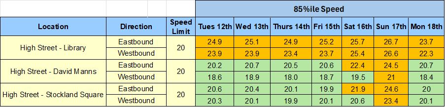 The speed data shows the mean speeds on High Street are between 18mph and 24mph depending on location and direction.