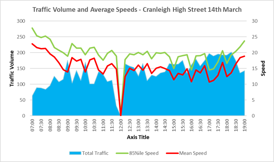 The chart below shows the difference between straight average and this 85 percentile on Thursday 14th March in the centre of the High Street. It also shows the volume of vehicles measured every 15 minutes across the period 7am to 7pm. As can be seen around midday traffic came to a complete halt, something we all frequently experience in Cranleigh.
